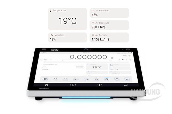 정밀 전자저울이 항상 최상의 상태로 사용할 수 있도록 실시간으로 점검합니다. 공기 부력 보정을 자동으로 수행하며, 저울의 정기 점검이나 정확도·감도에 대한 감사가 필요한 시점을 사용자에게 알려줍니다.