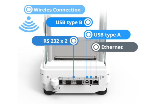 PS X7 정밀 저울은 2×RS232, USB-A, USB-B, Ethernet, Wi-Fi® 등 폭넓은 통신 포트를 지원하여 연구실 환경에 맞는 확장성을 제공합니다. 또한, Kensington Lock 기능이 탑재되어 장비를 도난으로부터 안전하게 보호할 수 있습니다.