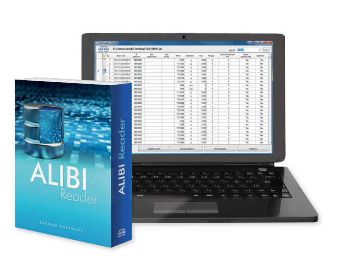 해당 저울의 ALIBI 메모리 및 기타 데이터베이스는 USB 메모리로 내보낼 수 있으며, 이전에 저장된 ALIBI 메모리 파일은 PC에서 Alibi Reader를 통해 열람할 수 있습니다. 이 데이터는 날짜, 사용자 코드, 제품 등으로 필터링할 수 있으며, CSV 형식으로 저장됩니다.